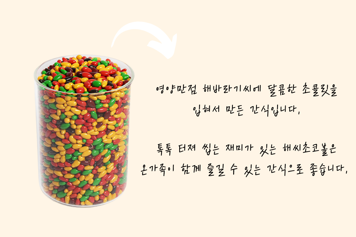 해바라기씨 위에 달콤한 초콜릿을 뿌려 담백하고 달콤합니다.